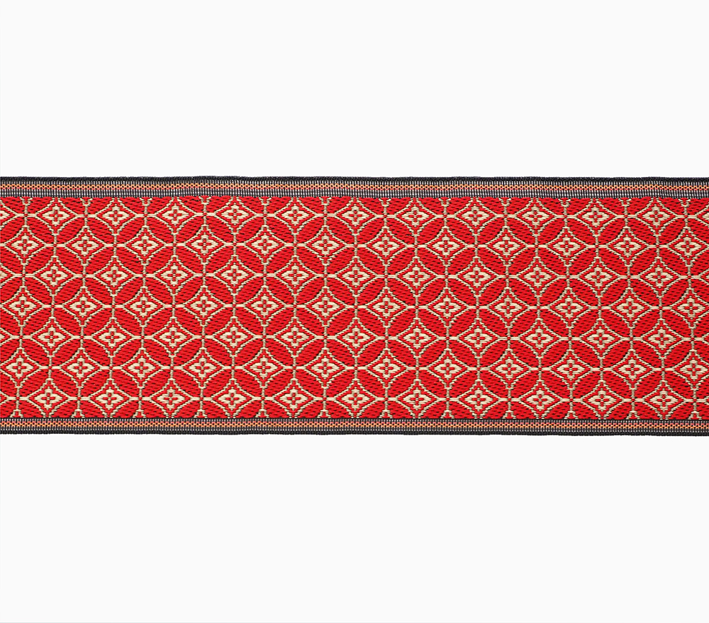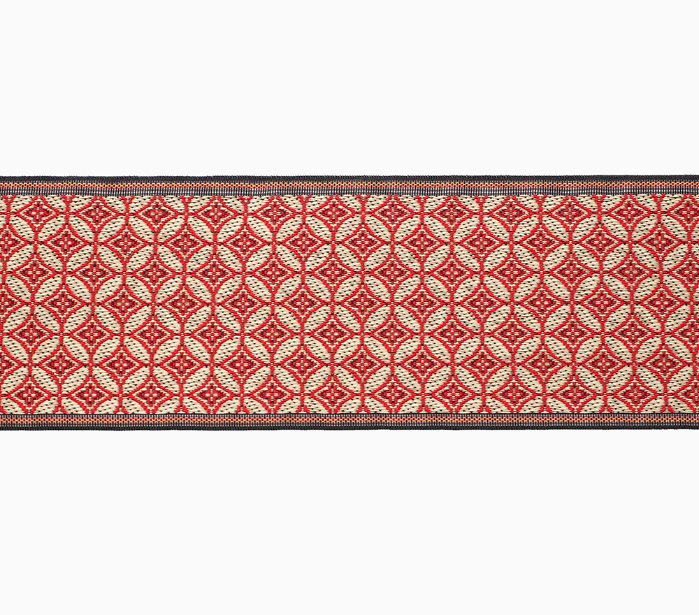 伝統的な和文様のひとつの「七宝」。円形が永遠と連鎖し繋がる柄から、円満、調和、ご縁などの願いが込められています。赤とベージュの優しい色味が印象的。