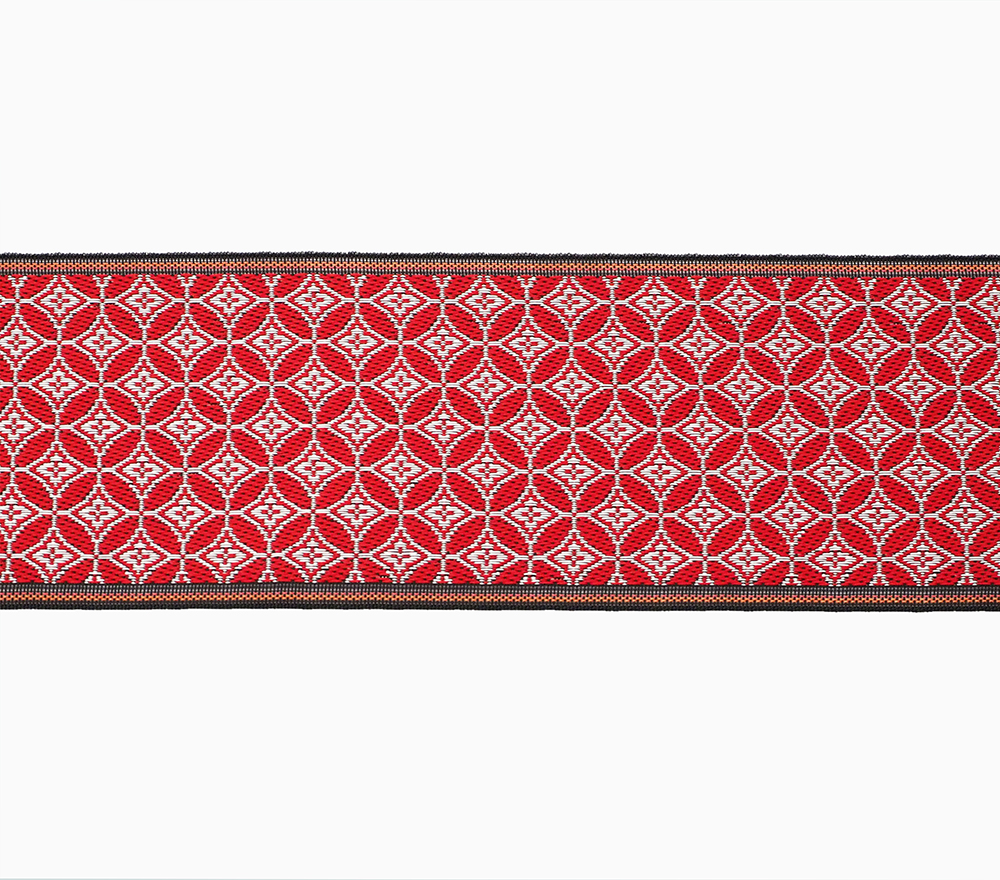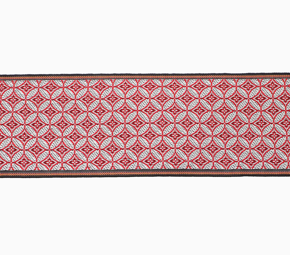 伝統的な和文様のひとつの「七宝」。円形が永遠と連鎖し繋がる柄から、円満、調和、ご縁などの願いが込められています。赤と白のおめでたい紅白カラー。