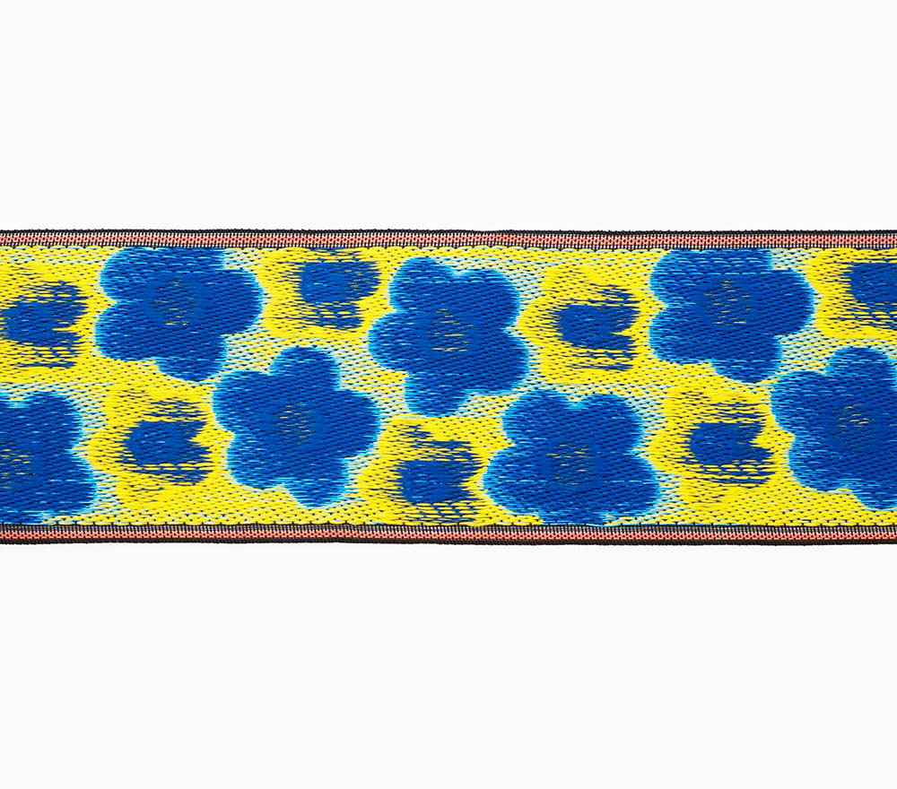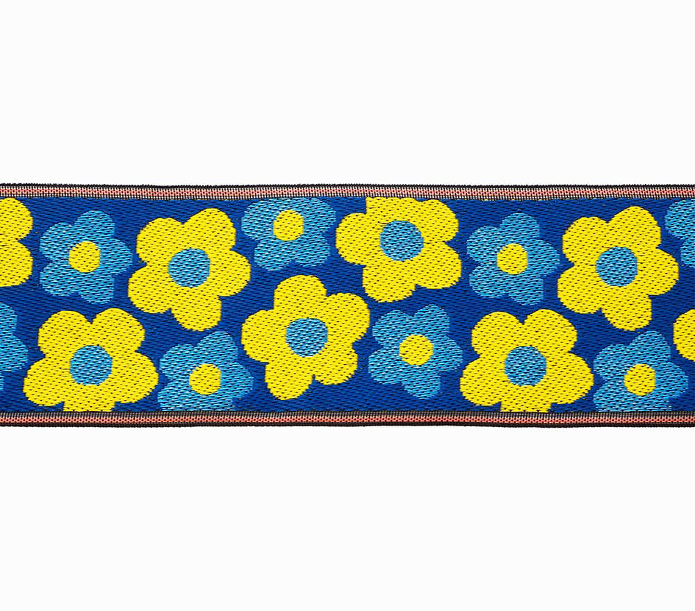 フランス語で「花」を意味するフルルと名付けられたこちらの畳縁は、明るくポップで、可愛らしい印象。花畑のような楽しい雰囲気をお楽しみください。ベースは深みのある青色。