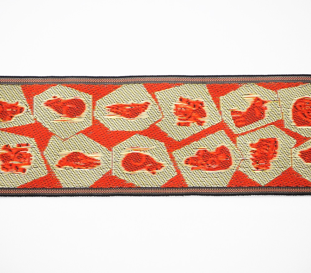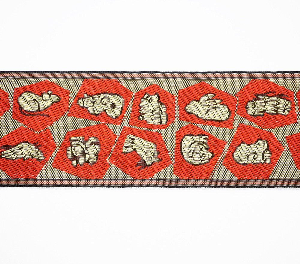 “十二支”をモチーフにした畳縁。十二支はもともと、紀元前の中国で暦などを表すために使われ始めたといわれています。十二支に動物を当てはめた結果、それぞれの字には、幸せを願うさまざまな意味がこめられています。