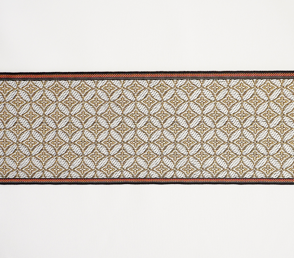 伝統的な和文様のひとつの「七宝」。円形が永遠と連鎖し繋がる柄から、円満、調和、ご縁などの願いが込められています。白とゴールドの煌びやかな色味。