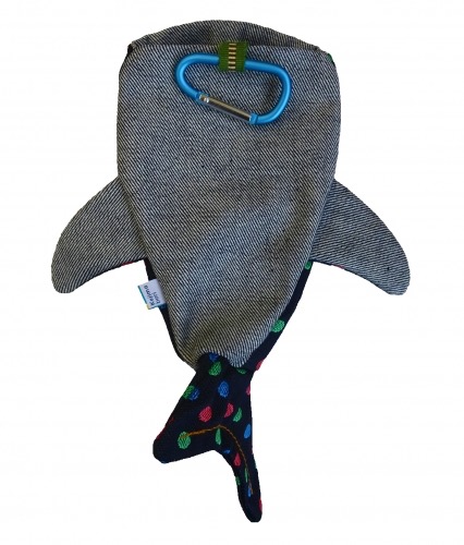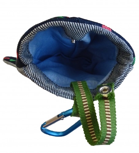 背中側には畳縁(畳縁素材)を、お腹側はデニムを、そして、カラビナを繋ぐ紐には真田紐を使っております。