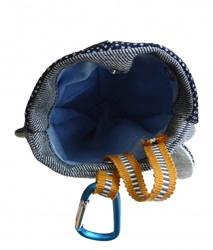 背中側には畳縁(畳縁素材)を、お腹側はデニムを、そして、カラビナを繋ぐ紐には真田紐を使っております。