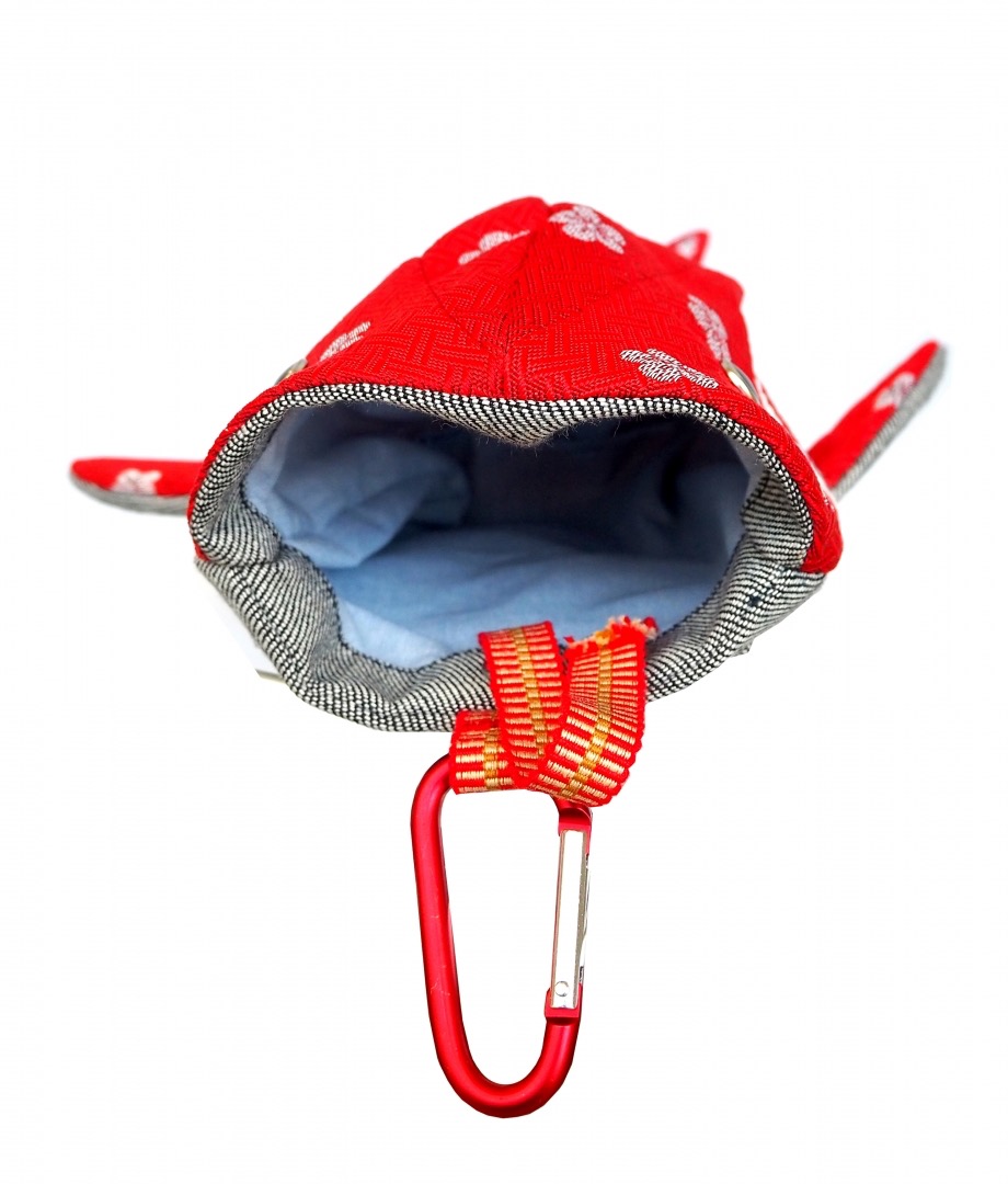 背中側には畳縁(畳縁素材)を、お腹側はデニムを、そして、カラビナを繋ぐ紐には真田紐を使っております。