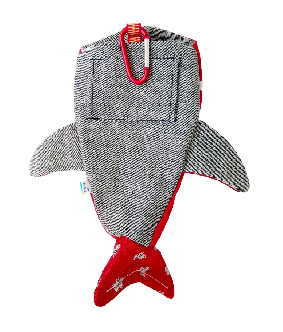 畳縁とデニムでできた畳縁鮫が成長して畳縁PLUSとして生まれました。口の中に、今までより大きい5.5インチサイズのスマートフォンなどが入ります。