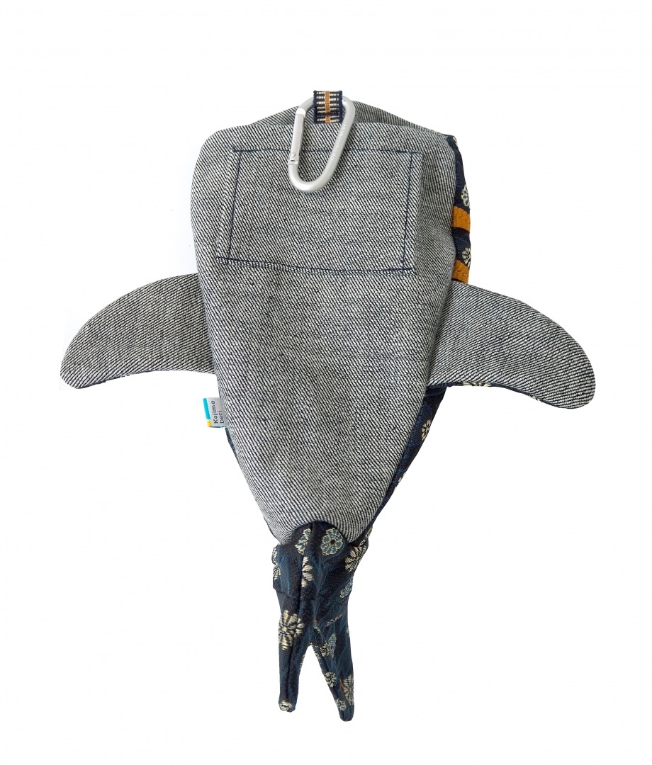 畳縁とデニムでできた畳縁鮫が成長して畳縁PLUSとして生まれました。口の中に、今までより大きい5.5インチサイズのスマートフォンなどが入ります。