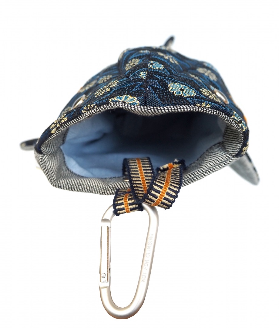 背中側には畳縁(畳縁素材)を、お腹側はデニムを、そして、カラビナを繋ぐ紐には真田紐を使っております。
