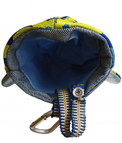 背中側には畳縁(畳縁素材)を、お腹側はデニムを、そして、カラビナを繋ぐ紐には真田紐を使っております。