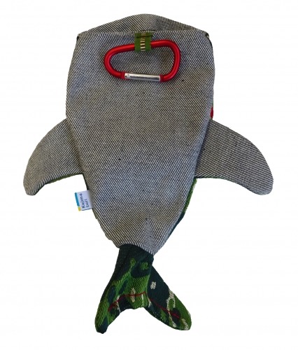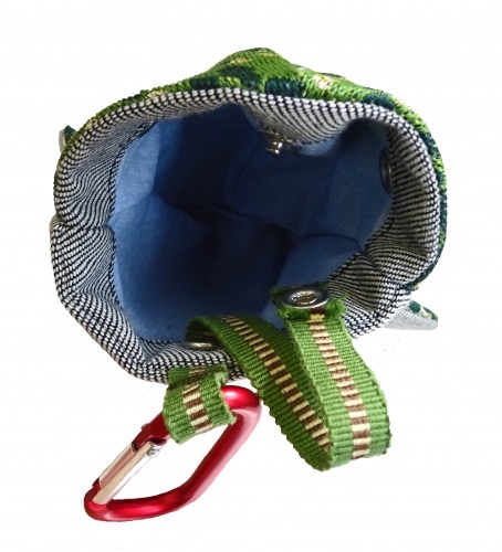 背中側には畳縁(畳縁素材)を、お腹側はデニムを、そして、カラビナを繋ぐ紐には真田紐を使っております。