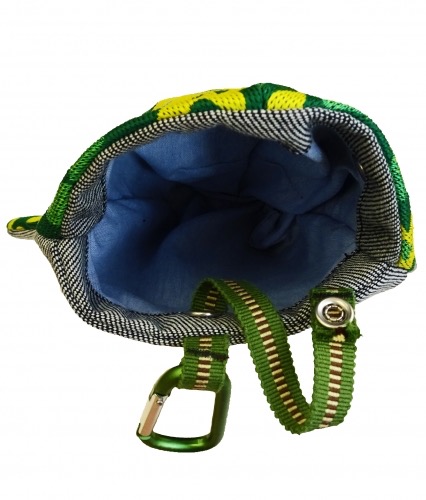 背中側には畳縁(畳縁素材)を、お腹側はデニムを、そして、カラビナを繋ぐ紐には真田紐を使っております。
