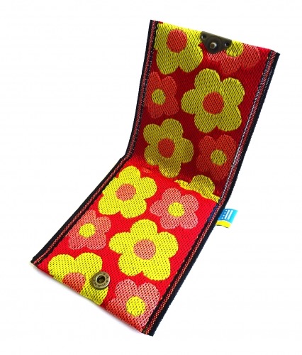 鮮やか、かわいい花柄が人気です。畳縁を使った小銭入れになります。接合部はボタン式。畳縁もあります。
