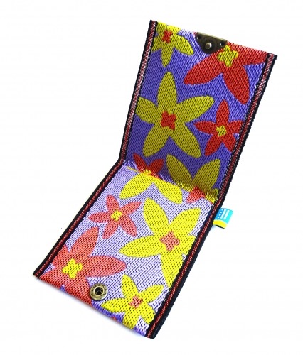 鮮やか、かわいい花柄が人気です。畳縁を使った小銭入れになります。接合部はボタン式。畳縁もあります。